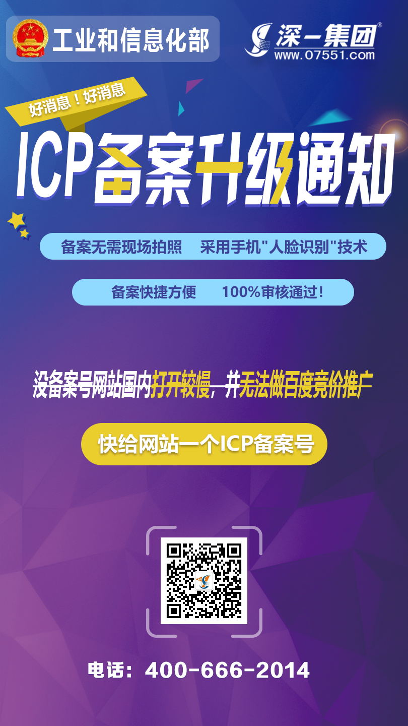 [深一ICP備案]好消息!ICP網站備案升級啦!備案無需現場拍照,直接采用手機"人臉識別"技術;備案快捷方便,100%審核通過;沒備案號網站國內打開較慢,并無法做百度競價推廣。詳細備案咨詢深一商務!